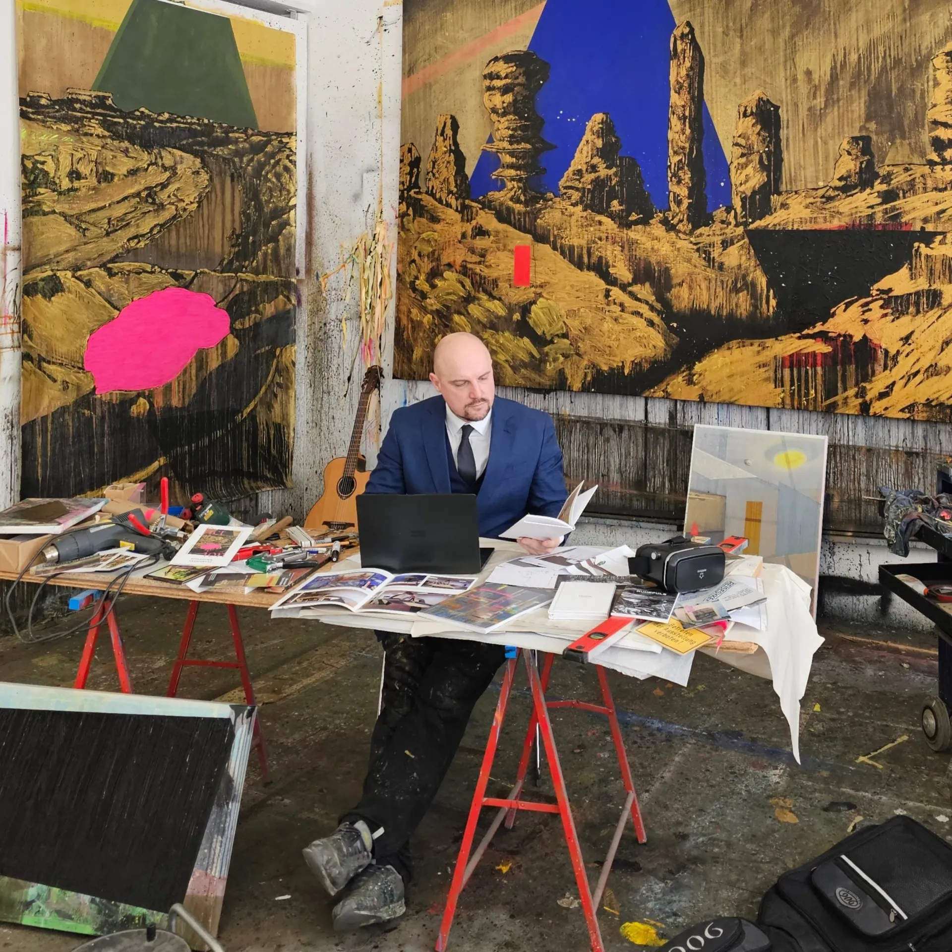 Alongside his studio practice, Manss creates performative and conceptual works. His mobile state project MOBILISTAN (developed since 2021 with Manaf Halbouni) is emblematic of this. Here, a stretched limousine becomes a fictional territory: equipped with its own national symbols, flag, anthem, passport, and social ambiance. Presented in museums and institutions from Berlin over Rome to Istanbul, MOBILISTAN questions systems of belonging and the fragility of statehood. It resonates with the painterly logic of Manss's imagery: space is constructed, occupied, and then destabilized—by the act of looking, of imagining.