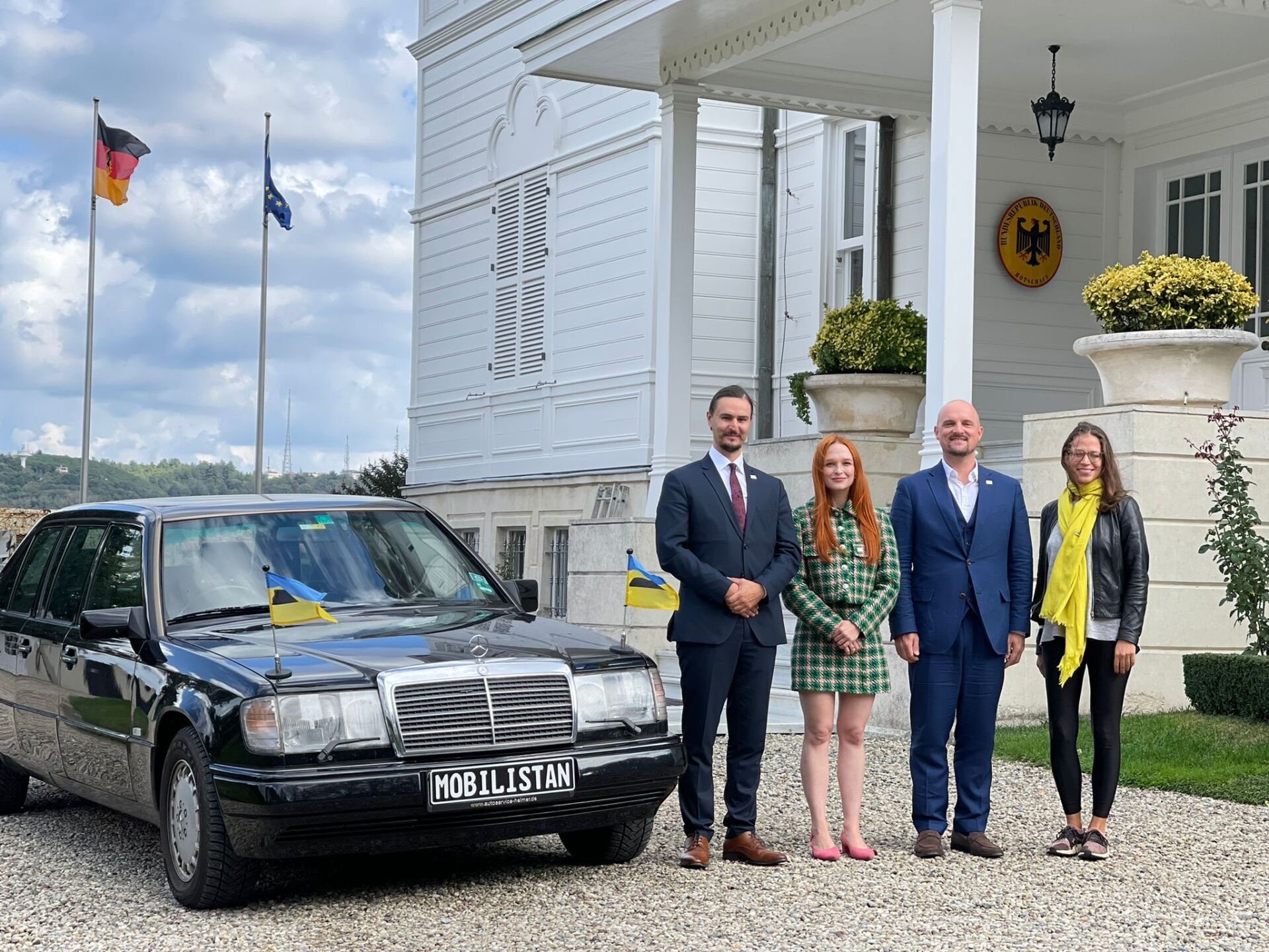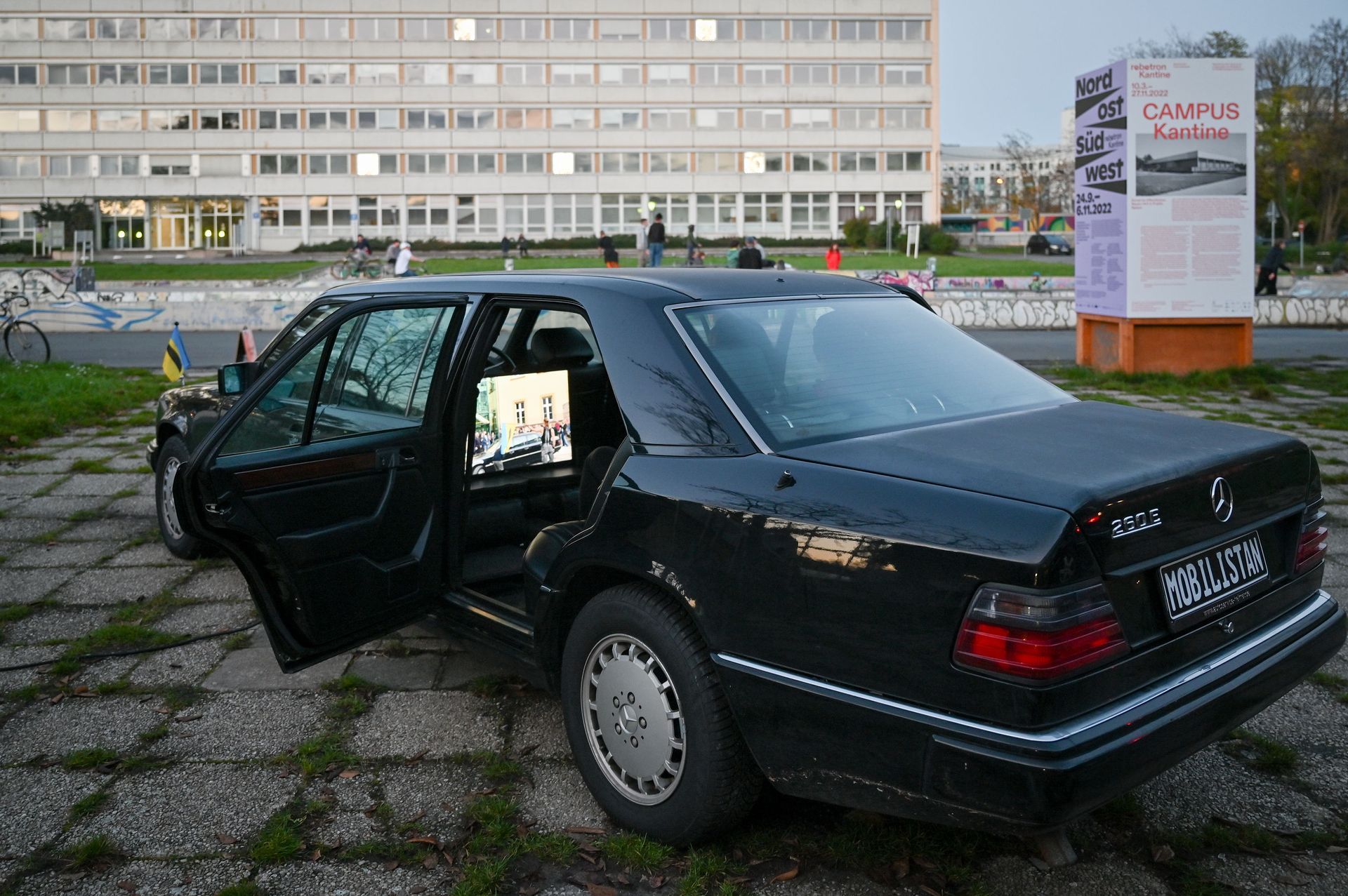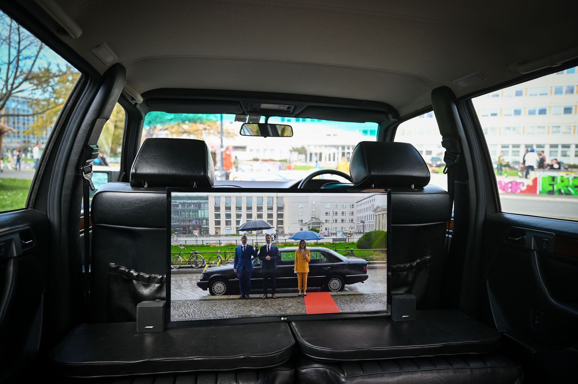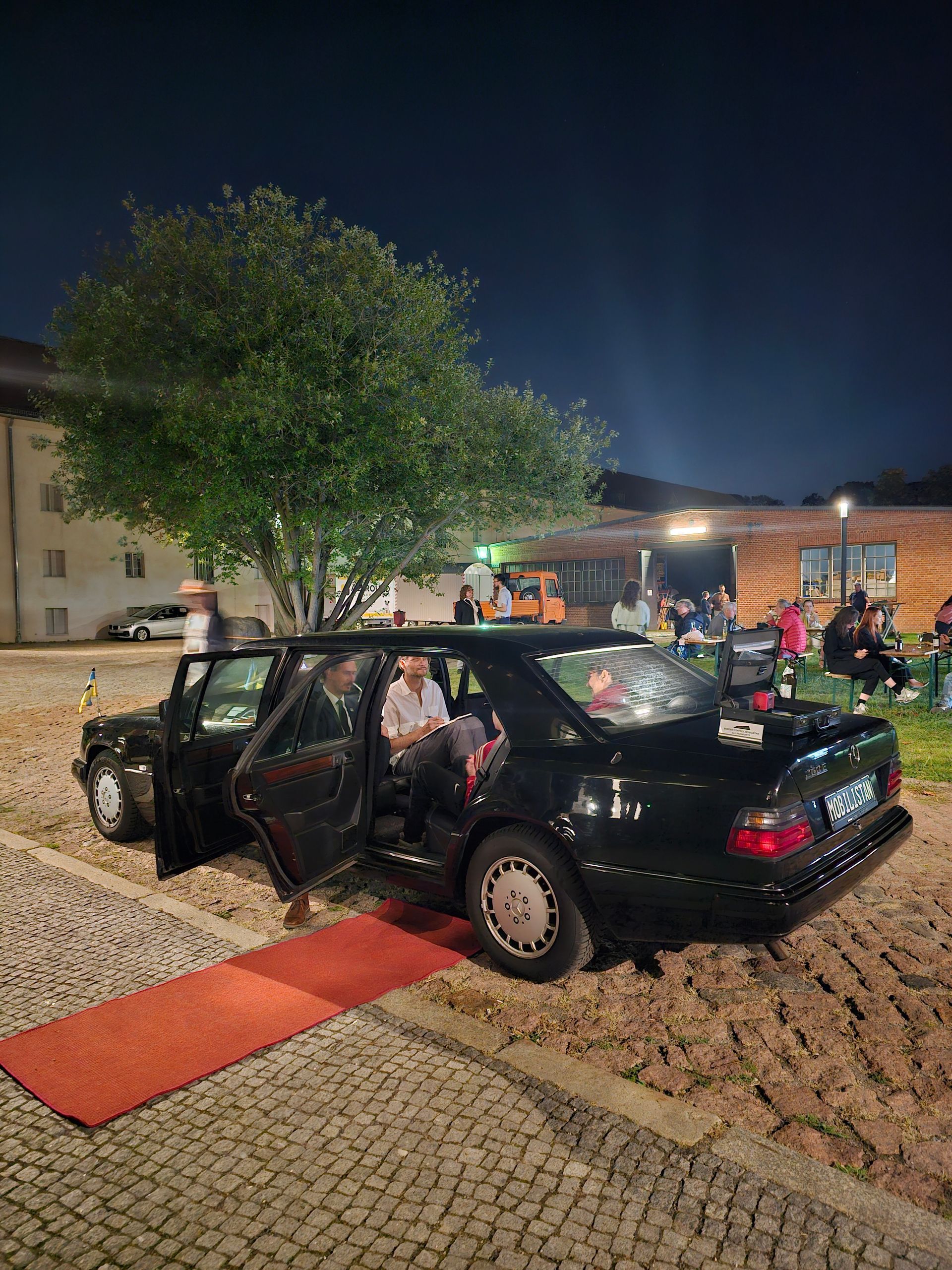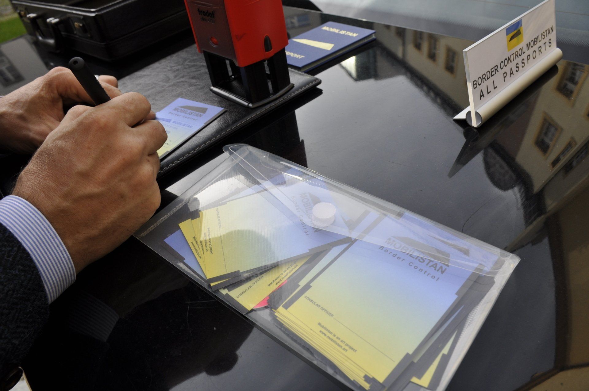 Our project MOBILISTAN is to be understood as a purely ART PROJECT dealing with issues of mobility, territorial limits, recognition, marginalization, freedom to travel and the desire to belong. Mobilistan is established on the area of a state limousine, thus forming the territory that can be entered or exited through the doors of the vehicle. Mobilistan has its own flag, anthem and passport. There are four permanent residents of Mobilistan, playing simultaneously several roles like State President, Foreign Secretary, Minister of Finance, Interior Minister etc. The four permanent residents are: Barbara Repe, Anne Manss, Manaf Halbouni and Christian Manss. They will determine the fortunes of Mobilistan: who is allowed to become a citizen, who gets a visa or where is the temporary location of Mobilistan.