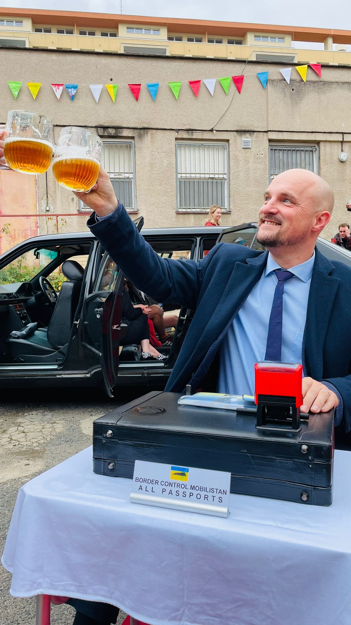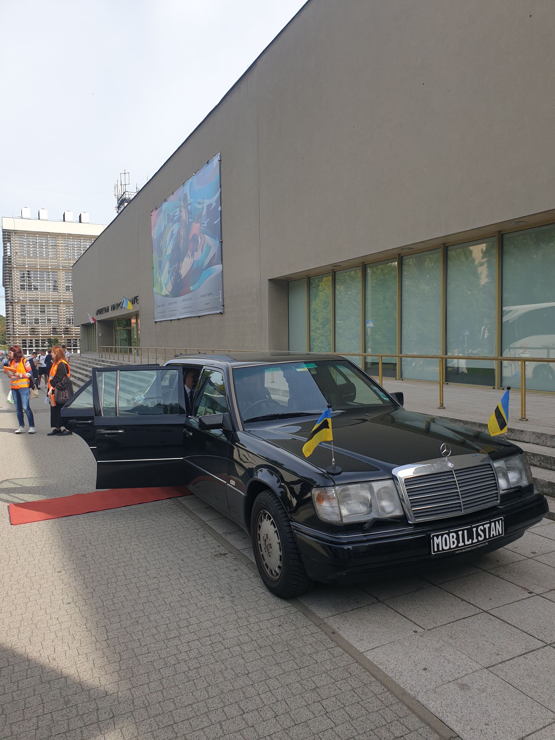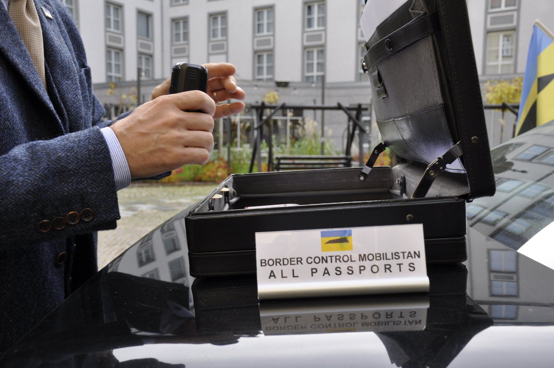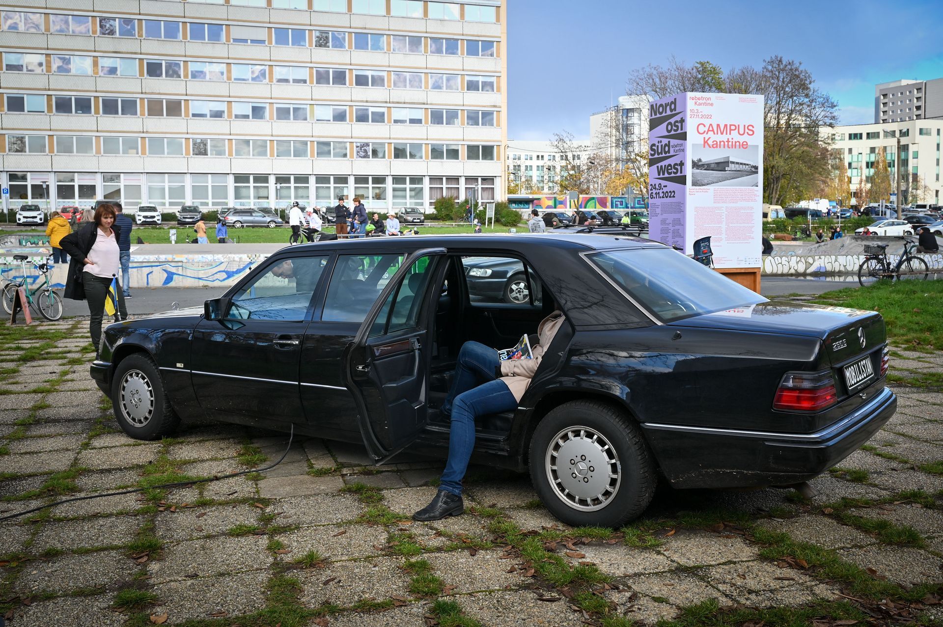 Our project MOBILISTAN is to be understood as a purely ART PROJECT dealing with issues of mobility, territorial limits, recognition, marginalization, freedom to travel and the desire to belong. Mobilistan is established on the area of a state limousine, thus forming the territory that can be entered or exited through the doors of the vehicle. Mobilistan has its own flag, anthem and passport. There are four permanent residents of Mobilistan, playing simultaneously several roles like State President, Foreign Secretary, Minister of Finance, Interior Minister etc. The four permanent residents are: Barbara Repe, Anne Manss, Manaf Halbouni and Christian Manss. They will determine the fortunes of Mobilistan: who is allowed to become a citizen, who gets a visa or where is the temporary location of Mobilistan.