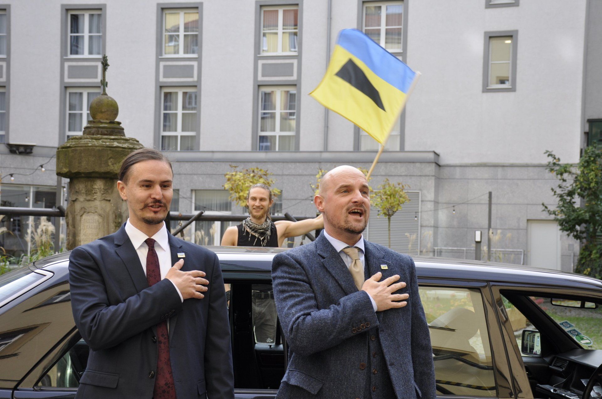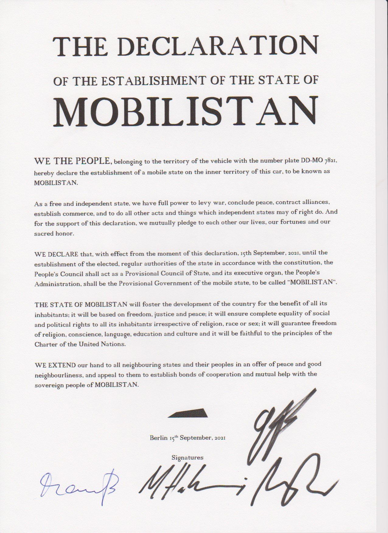 Manaf Halbouni and Christian Manss declared the first mobile state in the world in the limited space of a vehicle on September 15th, 2021 in Berlin.