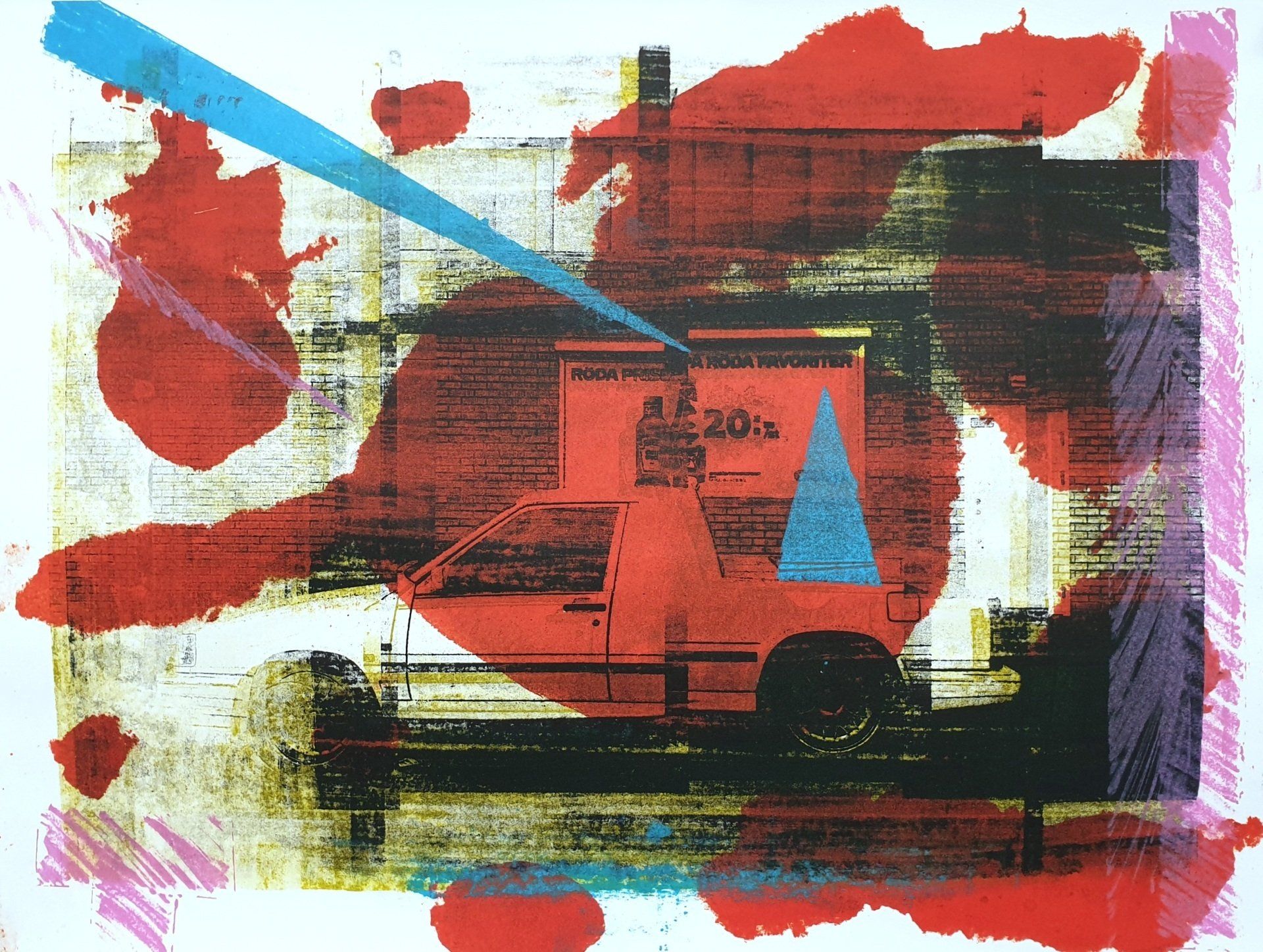 five lithographs(Edition of 50 each) without being in the same location. The artist in Dresden sent designs for each colour layer of the lithographs to the printer in Tidaholm, Sweden via the internet. Haberman sent test prints via the internet and mail for corrections back to Germany. This process took several months until the artist was satisfied with the test prints and the final prints could be made. The incentive for the project was the travel restrictions during the pandemic and how to conduct an artistic process that heavily relied on communication, colour values and teamwork. Thematically, the works also revolve around stagnation. Cars do not move, boats are in the woods and fountains have no water. The calm is only disturbed by geometric foreign bodies and restless lines.